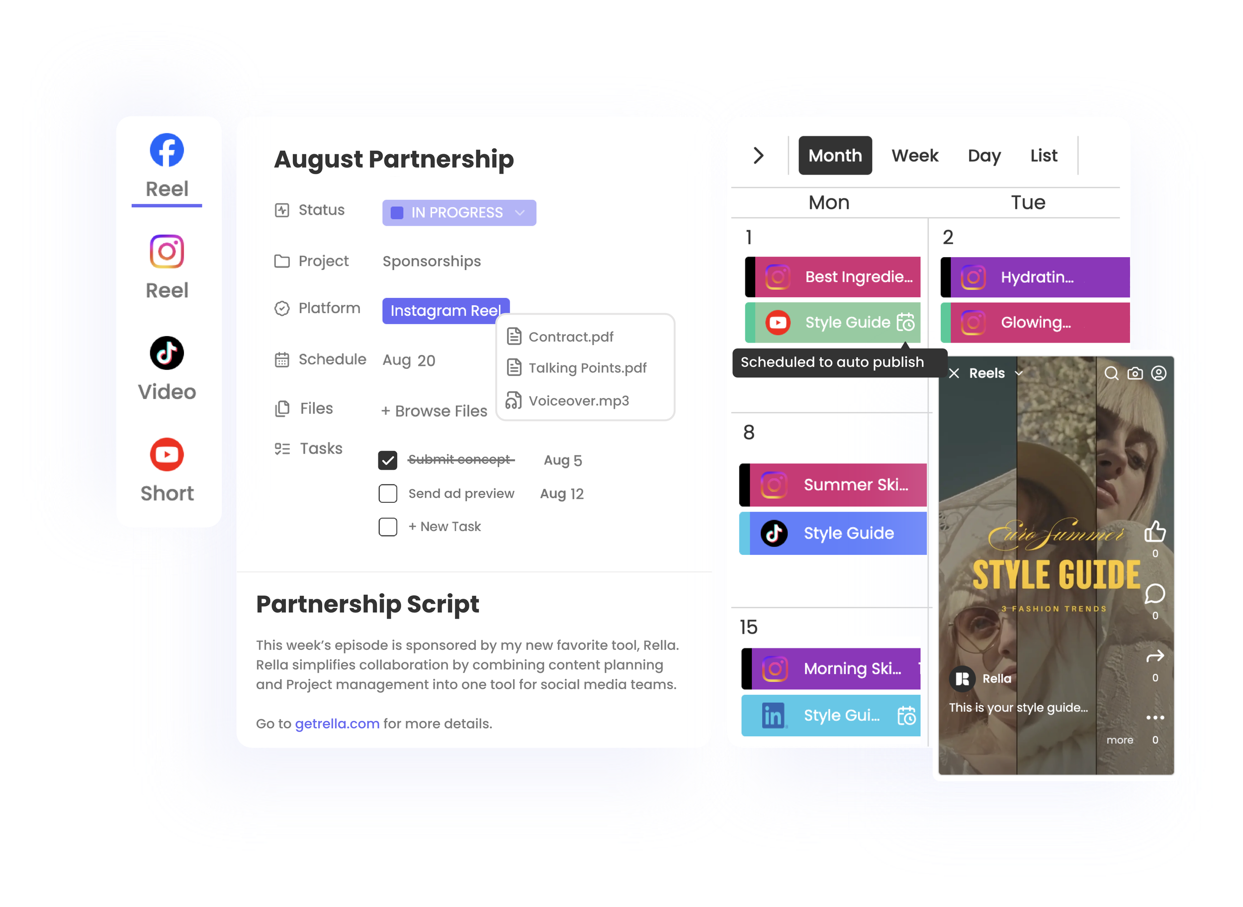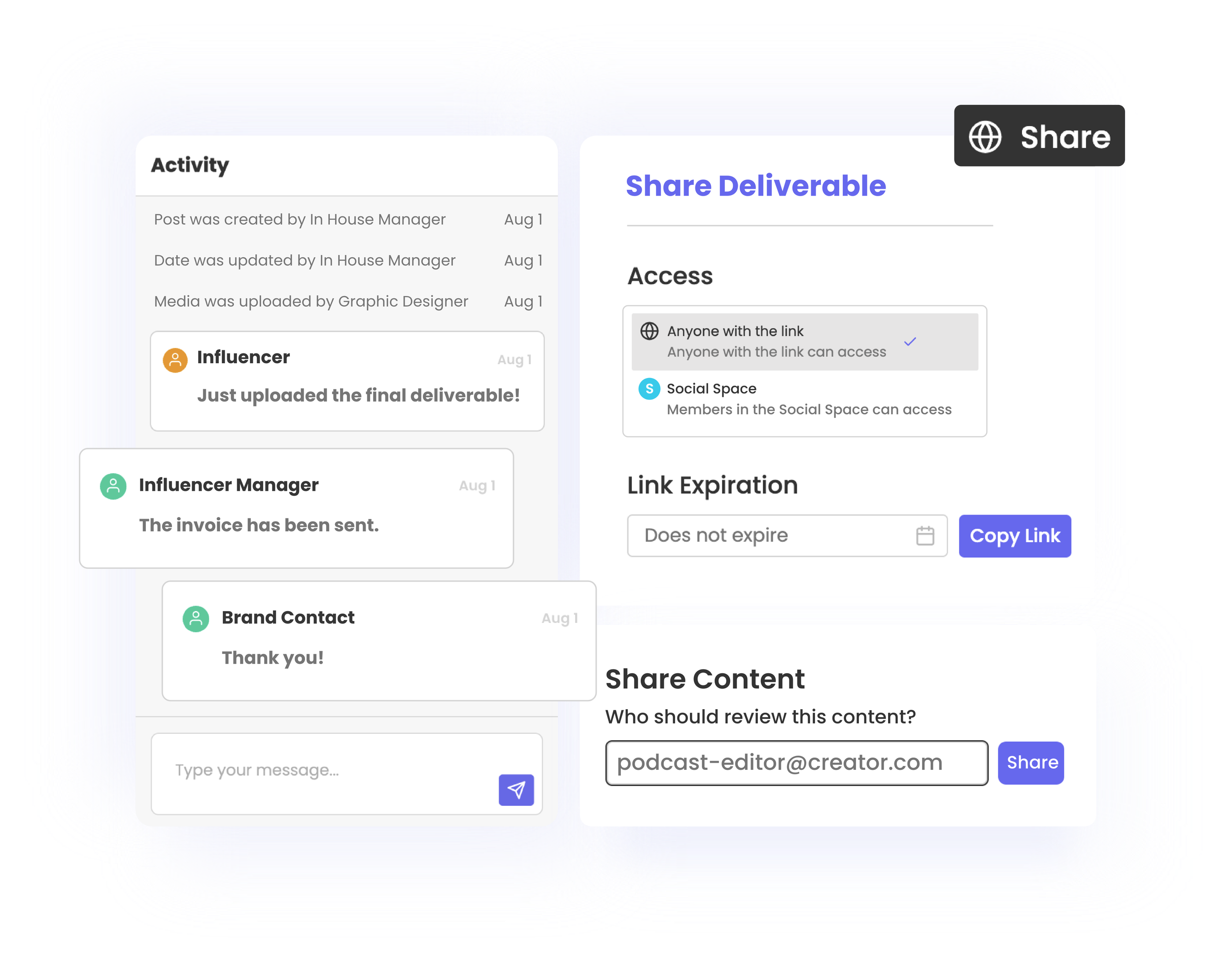 Maintain professionalism and submit polished content. Use Projects and Previews to receive approvals, no brand login needed.