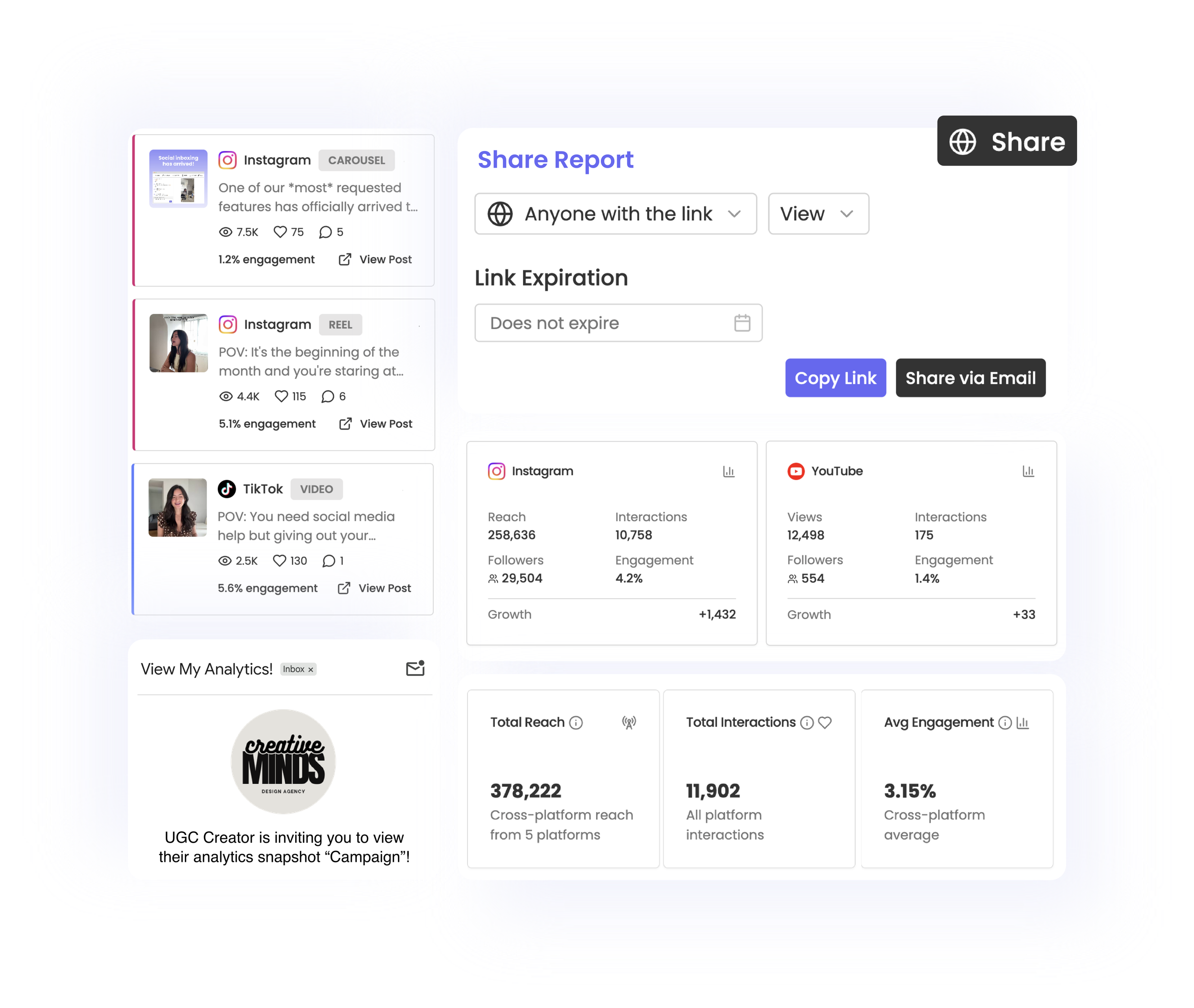 Generate branded reports in minutes, showcasing your reach, engagement, and campaign impact across platforms.