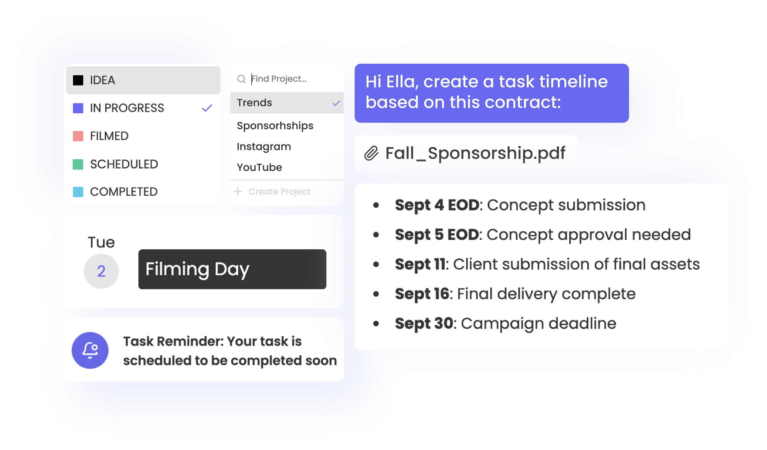 Receive reminders and manage filming schedules alongside contract deadlines. Use Tasks and Statuses to structure campaigns.