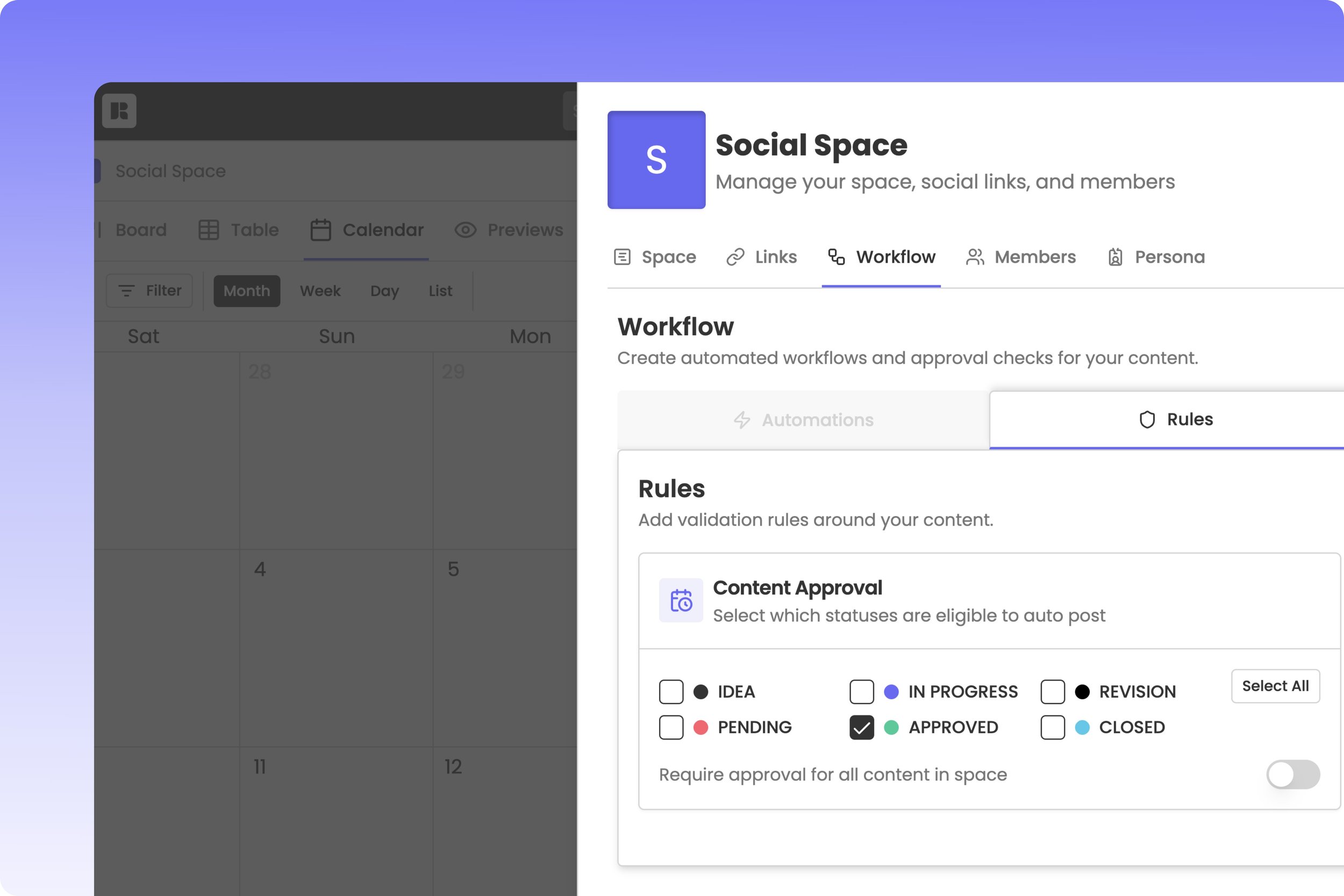 Once you access the workflow rules, select which statuses are eligible for auto posting. Toggle on “Require approval for all content in space” if you’d like your workflow rule to apply to every post. If you’d like your workflow rule to only apply to specific content, make sure you check “Requires approval” within a specific post.