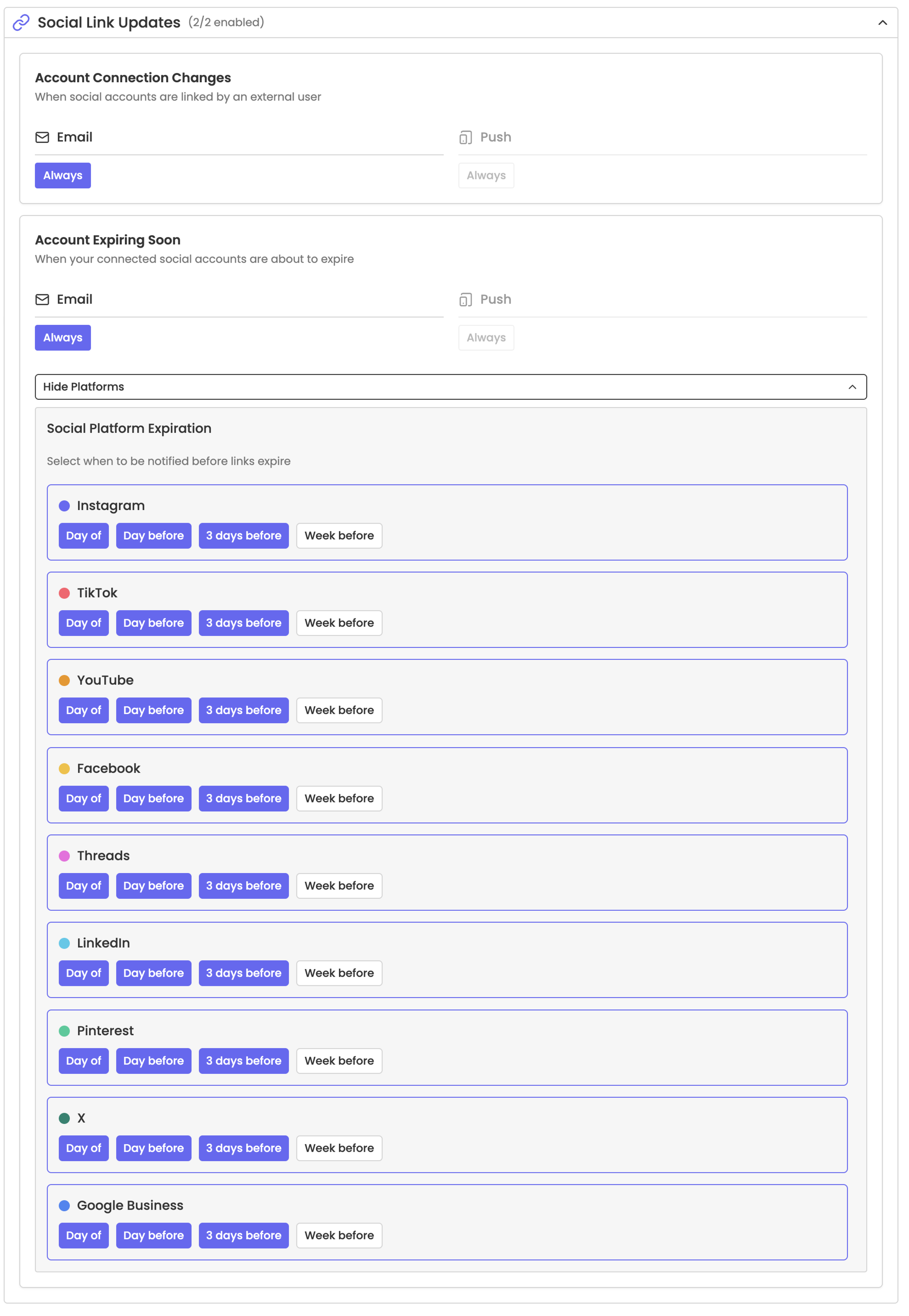 Turn this on to receive notifications when your connection is set to expire. For each platform, you can choose to get notified: