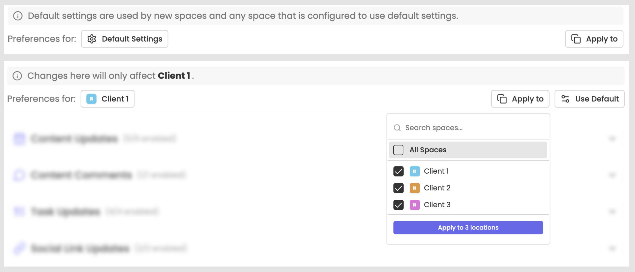 Once your selection is made, click Apply to locations to update all those Spaces at once. This option is useful if you want consistent notification rules across multiple Spaces.