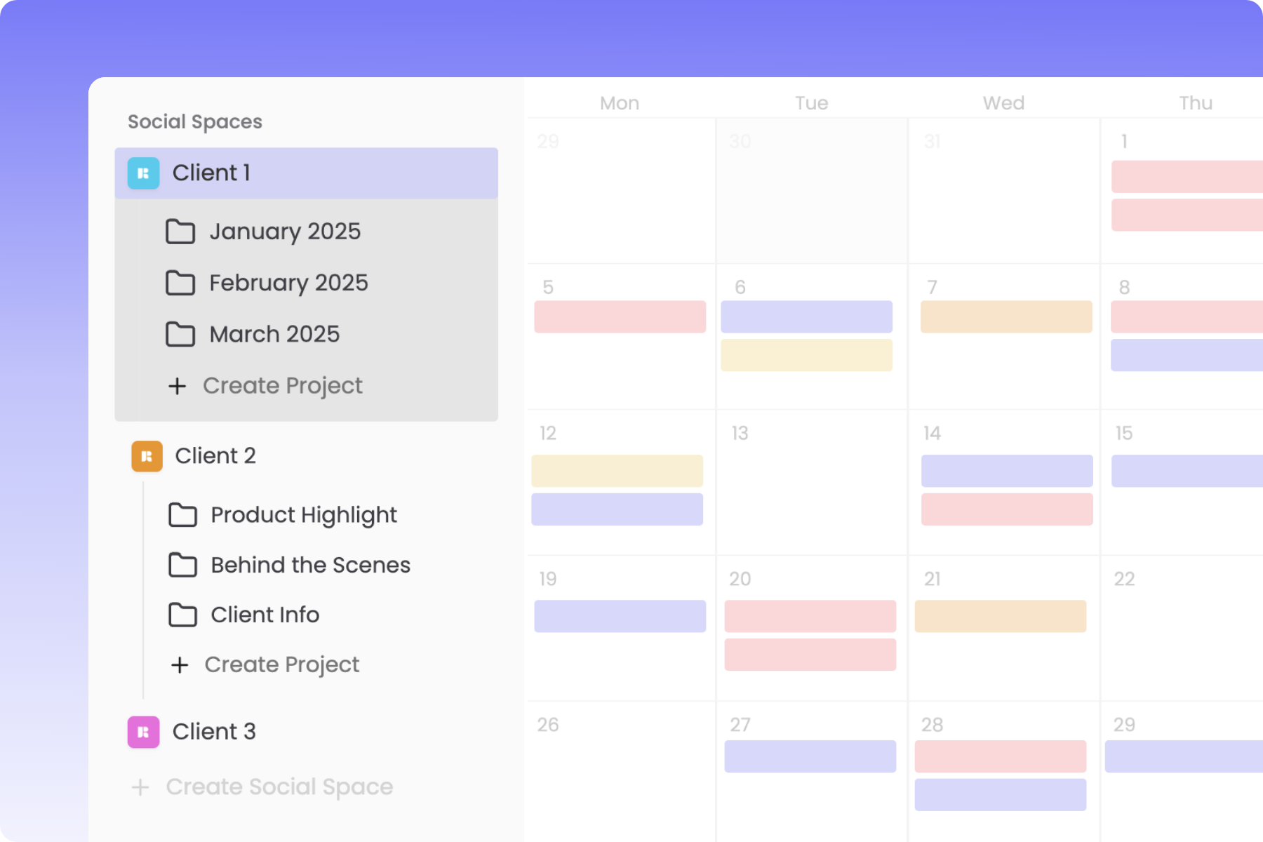 When managing batches of content, it’s essential to keep everything organized. With Projects on Rella, you can group posts into folders within a Social Space, allowing you to filter content and stay on top of your workflow. Whether you're handling content for multiple clients, overseeing campaigns, or streamlining content pillars, Projects make it easy to manage everything in one place. The flexibility of Projects ensures that your team can create a workflow that matches your specific needs.