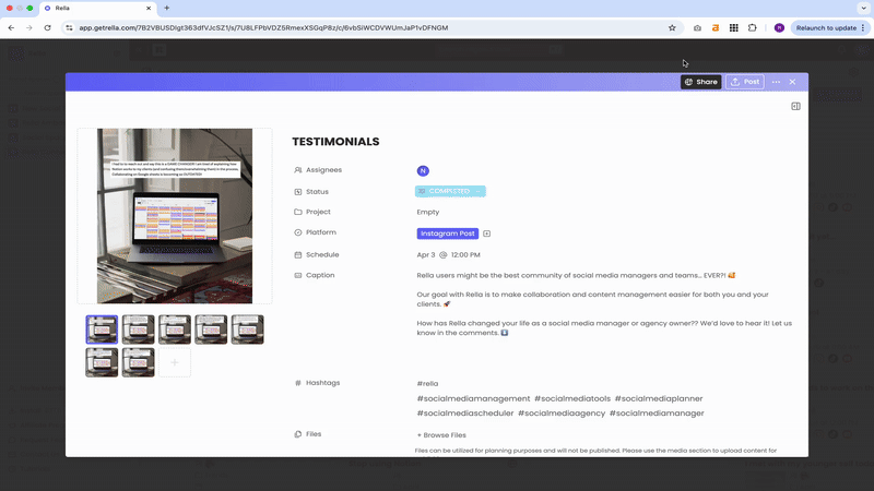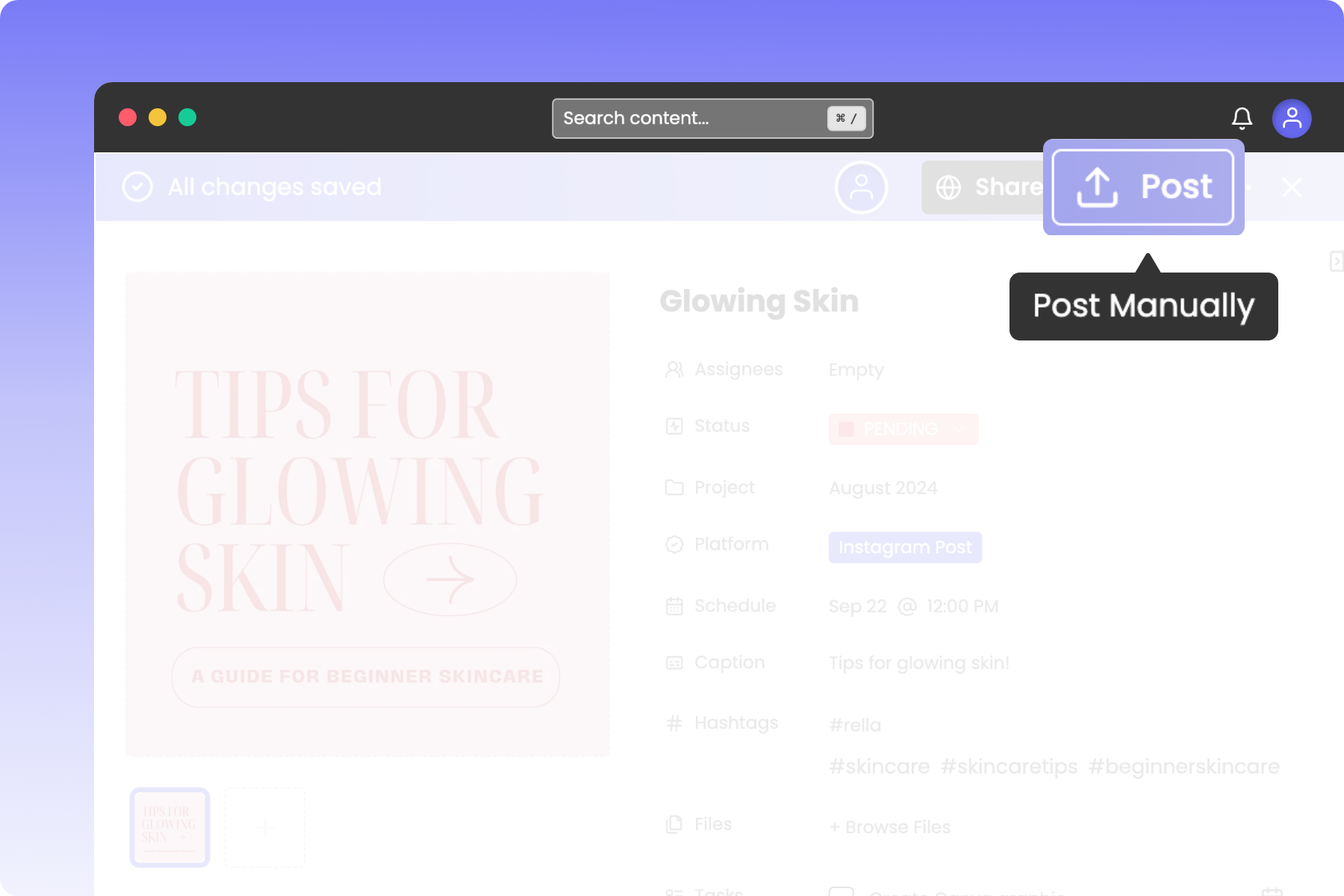 Click “Post” to be redirected to the platform selected. Your caption and/or hashtags will be copied to the clipboard. Your media will automatically download to your device. If you’ve scheduled content in advance you’ll receive an email notification that your post is ready to publish.