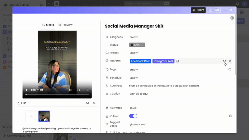 Let’s say you create a post on Rella with Instagram and Facebook listed as the platforms. If you’d like to change the details (caption, schedule date, etc.) for each platform, repurposing lets you customize fields, without starting from scratch.
