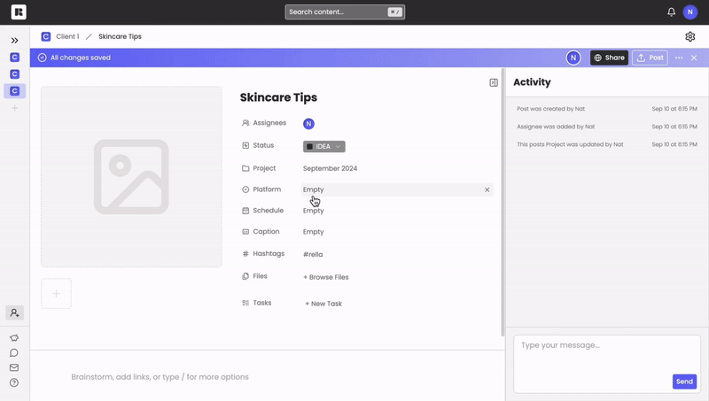 Unlike other content management tools, you can plan content on Rella without linking a platform! If you’re looking to auto post you’ll need to link social accounts to Rella.