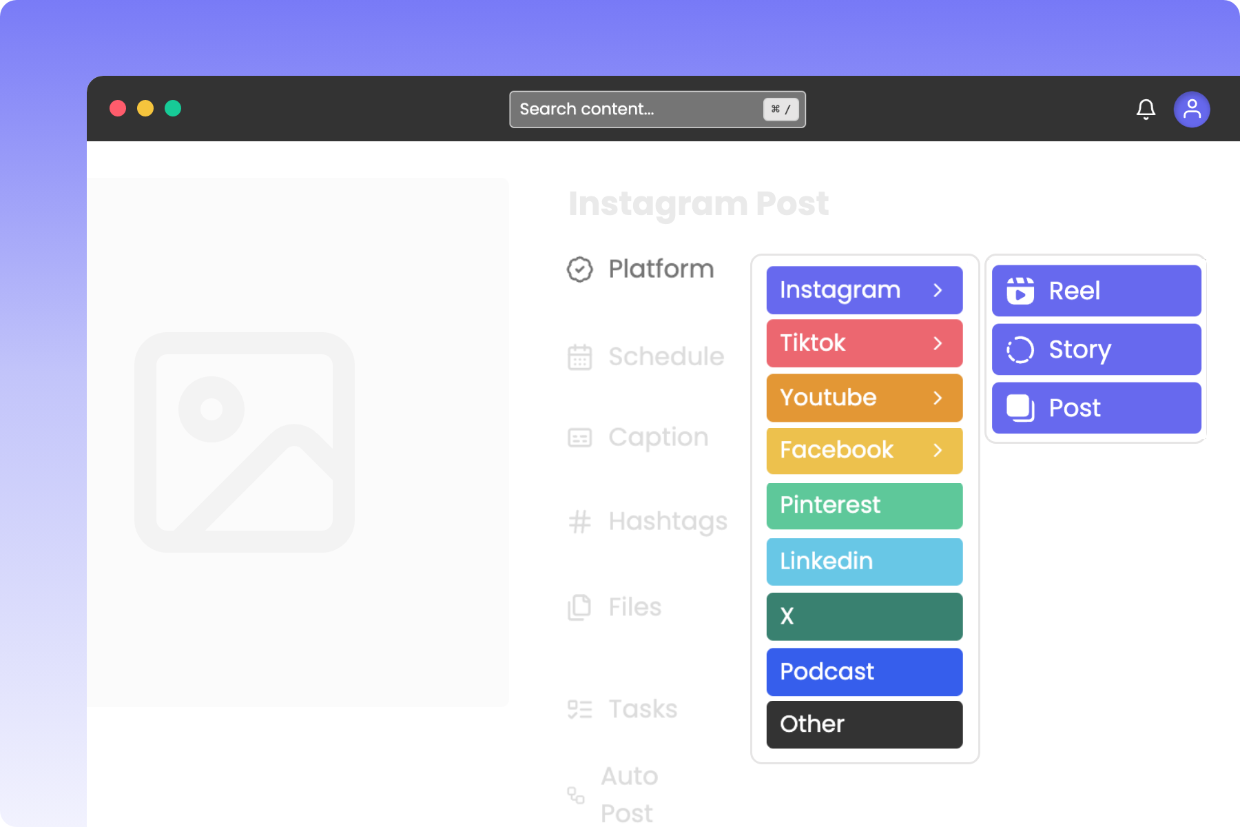 To plan content for multiple platforms with separate schedule dates or captions, navigate to the “Repurpose content” option attached to the Platform field. Repurposing will split the multi-platform post into individual pieces of content for each platform.